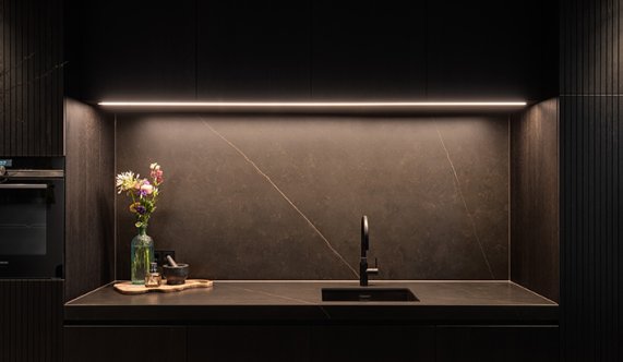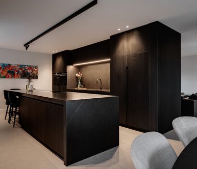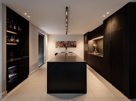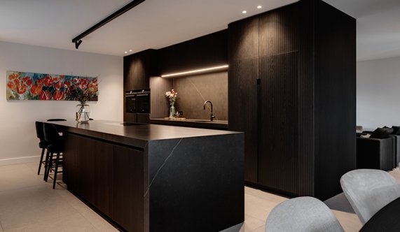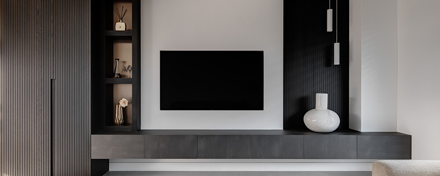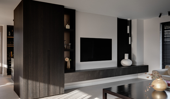 Het hele productieproces wordt eerst tot aan de laatste millimeter uitgedacht en uitgewerkt. We zorgen dat elk detail op papier staat voor we ook maar één plank beginnen te zagen. Voor dit particuliere project verzorgden we de complete inrichting van keuken, tv kast tot badkamer.
